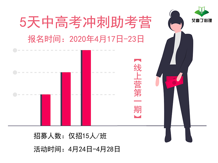 為了幫助廣大考生和家長(zhǎng)更好的應(yīng)對(duì)今年的高考,艾壹丁心理推出【5天中高考沖刺線上助考營(yíng)】活動(dòng),將從:焦慮情緒、壓力應(yīng)對(duì)、學(xué)習(xí)策略、2020年高考解讀、高考牛人分享最后階段的提分技巧五個(gè)方面全方位的提供幫助。